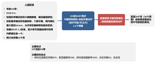 脑转移与NSCLC的不良预后密切相关;20-30%的NSCLC患者在初次诊断时合并脑转移,显著影响患者的生存和生活质量2,3。由于化疗药物不能有效穿透血脑屏障,手术切除及放疗是NSCLC脑转移综合治疗中的重要手段,但疗效欠佳。针对这一未满足需求,研究者前期开展了PD-1/PD-L1单抗单药或者联合化疗治疗NSCLC脑转移患者的小样本、前瞻性研究,纳入人群主要为无症状、小病灶患者群体。然而在临床实践中,有症状或病灶较大的脑转移患者常常需要联合脑部放疗。既往研究提示,脑部放疗联合免疫治疗具有协同抗肿瘤活性,似乎是伴脑转移NSCLC患者的一种潜在治疗手段4。但目前相关研究开展较少,仍缺乏较为明确的应用证据。因此,如何有效治疗脑转移患者是临床医生必须考虑的问题。